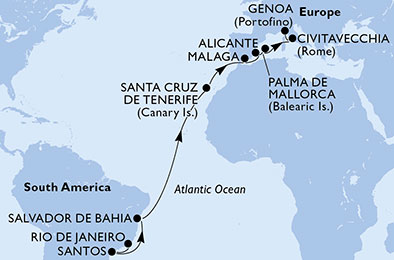 Rio De Janeiro, Santos, Salvador, Santa Cruz De Tenerife, Malaga, Alicante, Palma De Mallorca, Civitavecchia, Genoa