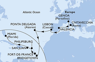 Genoa, Civitavecchia, Valencia, Lisbon, Ponta Delgada, Bridgetown, Fort De France, Philipsburg, San Juan, Miami