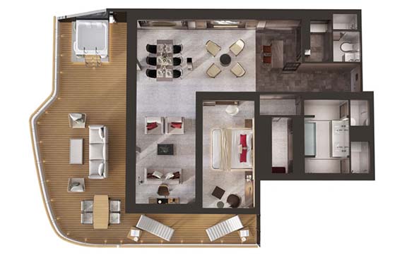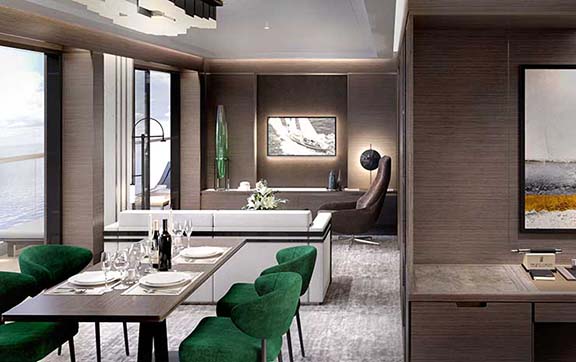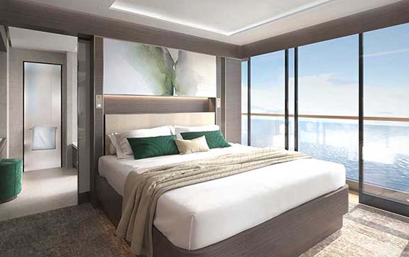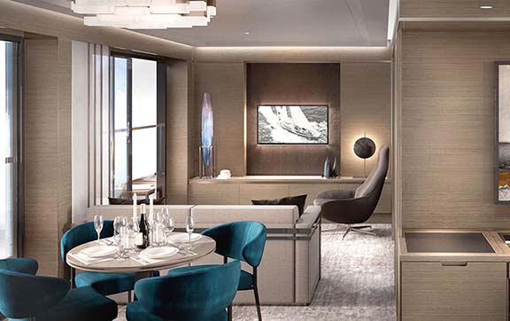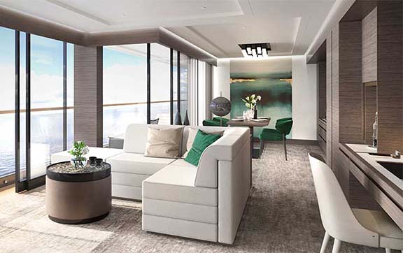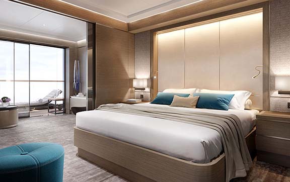 Designed for the comfort of luxury travelers and each with its own terrace, the yacht’s suite experience is unrivaled at sea.