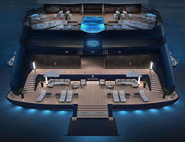 Sitting right at the water’s edge, the Marina offers sun loungers and a generous choice of water toys. Like a private beach with seamless entry into the sea, it’s the go-to spot while at anchor. Just steps above, the Marina Terrace serves handcrafted cocktails and light bites with stunning views