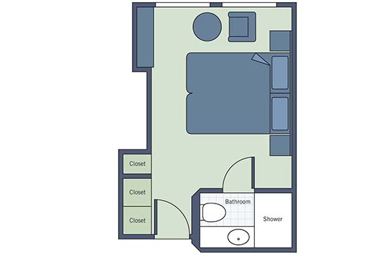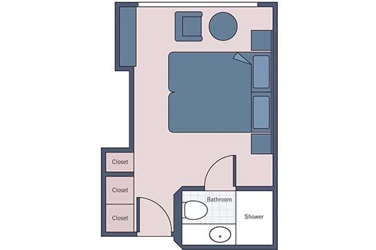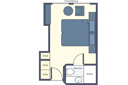 Handcrafted Savoir® of England bed, built-in closet, hair dryer, safe, individual thermostat, flat-screen TV with infotainment center and satellite, and bottled water