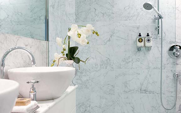 Marble bathroom with Hermès bath and body products, plush towels, special towel warmers, backlit magnifying mirror, heated mirrors, cozy bathrobes and slippers