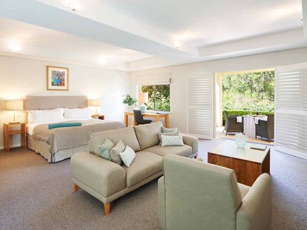 These spacious and airy rooms offer an open plan lounge area with views over expansive lawns to the lake.