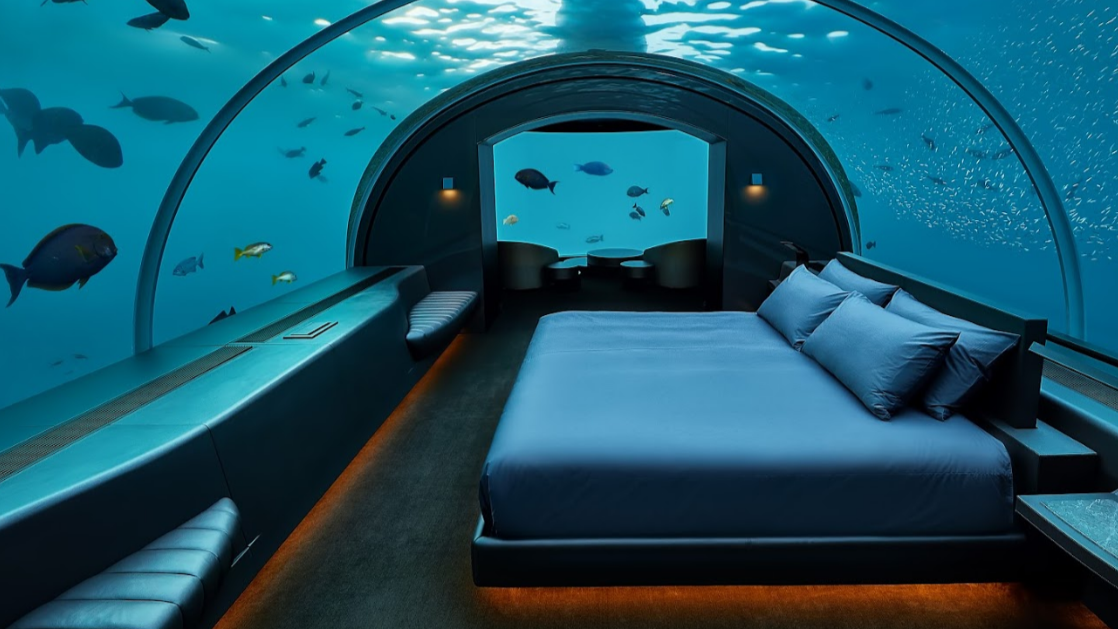A unique two-level residence with an underwater master bedroom submerged over 16 feet below sea level. Features luxury amenities, a private deck above water, and 24-hour butler service. Designed for privacy and an immersive ocean experience, accommodating up to 6 adults (or families).
