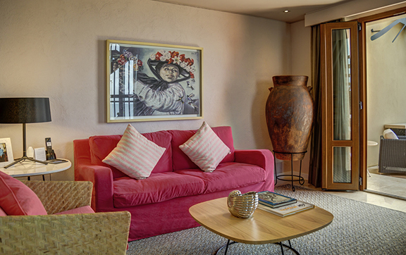 01 Suite split over two levels. Equipped with spacious bathroom, living area, terrace with view of the Caribbean Sea and whirlpool tub. Every room features sculptures, paintings, books and photos of the life of artist Enrique Grau. Transfer included.