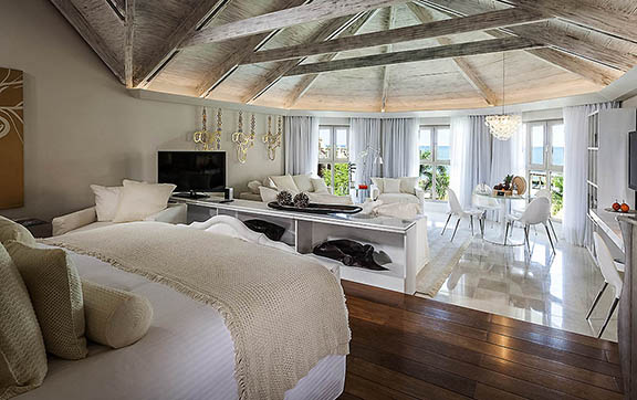 01 Suite split over two levels. Equipped with spacious bathroom, living area, terrace with view of the Caribbean Sea and whirlpool tub. Every room features sculptures, paintings, books and photos of the life of artist Enrique Grau. Transfer included.