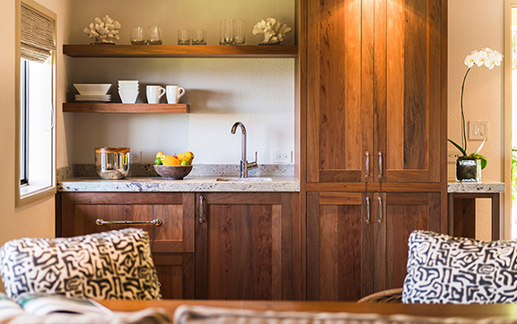 - Custom-crafted rich Hawaiian Ohia wood cabinetry, doors and details by Maui Custom Woodworks