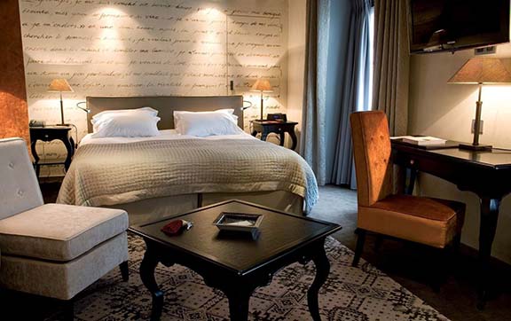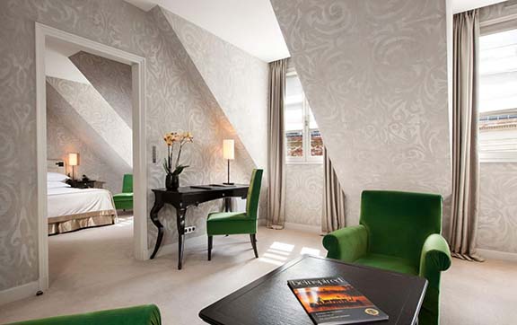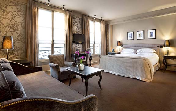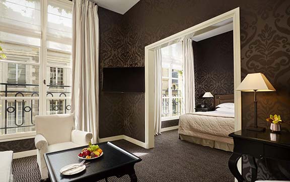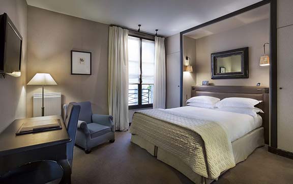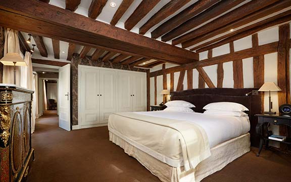 Suites are composed of a room with a spacious living-room, 1 or 2 bathrooms, a walk in closet, a desk, a high ceiling or an exposed beams ceiling so typical from Le Marais area, and other well-thought out details make for a flawless comfort. There is also the option of connecting one of these suites to another Deluxe room or to the Suite de la Reine. The Suite Victor Hugo has a kitchen with hotplates and micro-wave oven, offering the charm and the comfort of an elegant Parisian apartment. Suites are decorated in a classic, cosy and refined style.
