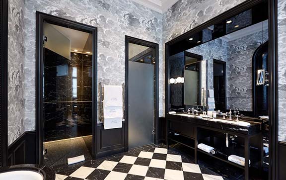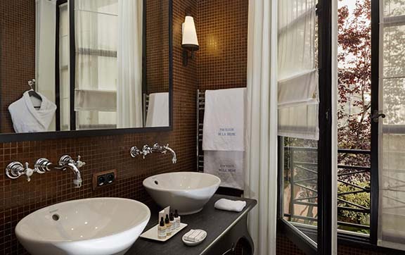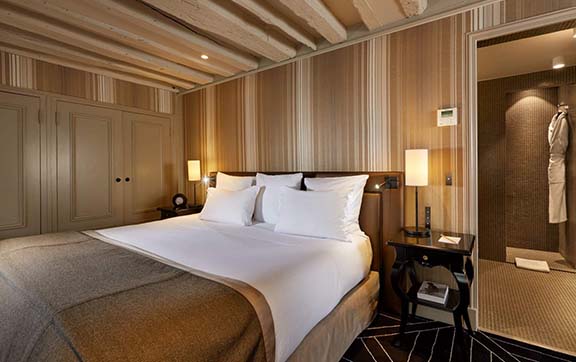 Positioned at the corner of the building, the suite has large double aspect windows and a spectacular high ceiling which flood the suite with plenty of bright Parisian light. Suite de la Reine is characterised by exquisite design details: original 17th century Versailles parquet flooring, a handcrafted chandelier specially commissioned from Alexandre Logé for the suite and gold touches. An antique fireplace dating from the 17th century, typical of Le Marais, gives a nod to the history of the area. Meanwhile, antique touches are deftly combined with contemporary furnishings by designer Didier Benderli from Kerylos Intérieurs. The marble bathroom has a neutral colour palette with mustard yellow highlights as well as underfloor heating – bringing the suite up to date with a deeply luxurious feel. A separate dressing room as well as an open shower in the bedroom add a touch of further decadence. Suite de la Reine: all the charm and elegance of an Hotel Particulier – with all the understated sophistication of a private home. More than simply a Suite – a Parisian home away from home.
