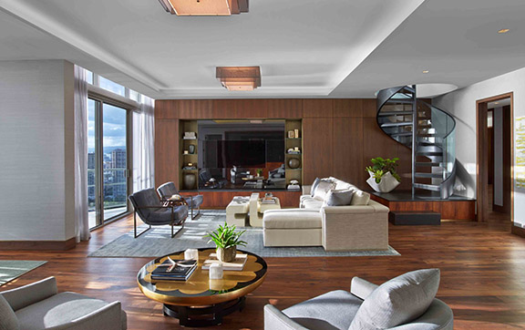 These residential-style suites offer fully-equiped kitchens, spacious living spaces, luxury amenities, and stunning views from floor-to-ceiling windows.