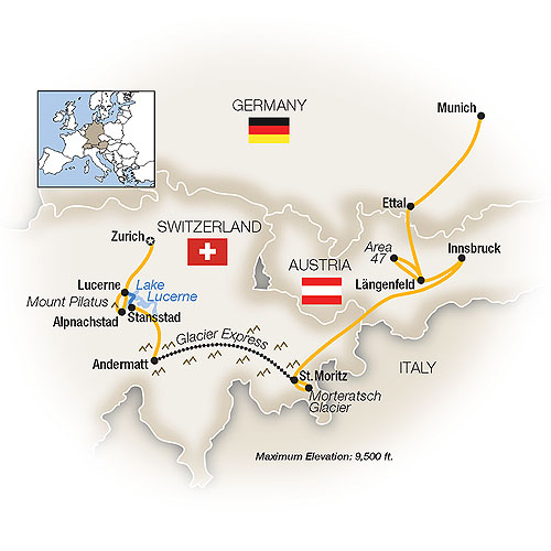 Very few places on Earth offer as much breathtaking beauty – and outdoor adventure – as the Alps! Come along with Tauck Bridges on a weeklong Switzerland family holiday filled with discovery and family fun… from Lake Lucerne and Mount Pilatus in Switzerland… across the mountains aboard the Glacier Express to famous St. Moritz… into the Austrian Alps and Innsbruck… and on to the Bavarian magic of Munich! Go whitewater rafting, mountain bicycling, rock and rope climbing… enjoy a look at Neolithic life and traditional Tyrolean fun and games… ride cable cars and the world’s steepest cog railway at Mount Pilatus, more than 125 years in operation (summer only)… watch an exciting ski-jump demonstration and more!