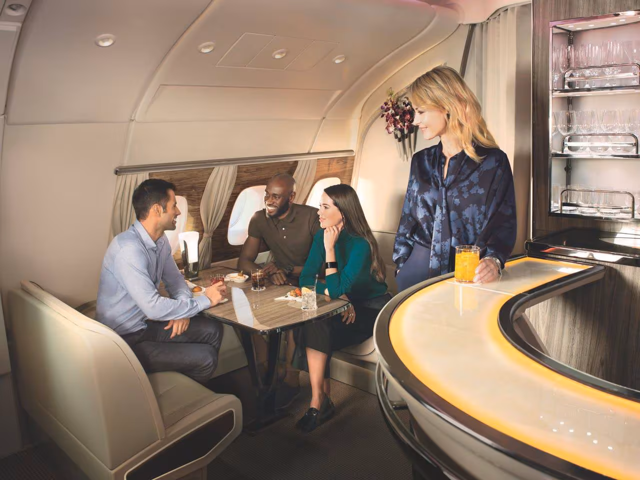 Enjoy conversation, cocktails and hors d’oeuvres in the Emirates A380 Onboard Lounge. When you’re ready for a snack, a beverage or casual conversation, the exclusive Onboard Lounge offers the perfect mid-flight diversion.