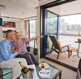 Each Suite contains an unusually large ensuite bathroom and over 90% of them boast an all-weather French Balcony. Plush bedding, a flat-screen TV, sitting area, minibar and safe complete the luxury river cruising experience.