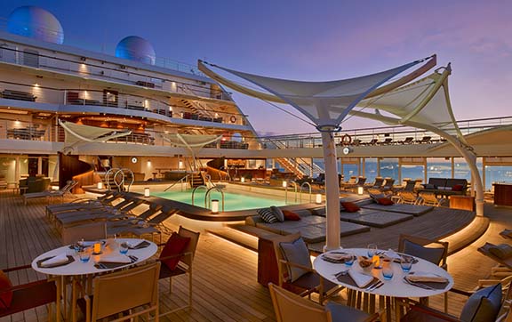 Relaxed poolside dining offering luncheon buffets, salads, soups, grilled specialties and freshly baked pizza. Dinners feature a full menu in an alfresco setting. For The Patio, Chef Keller has developed exclusively for Seabourn, a signature Napa burger, as well as an artisanal hot dog dubbed the Yountwurst, named for the hometown of The French Laundry, Ad Hoc, and the original Bouchon and Bouchon Bakery.