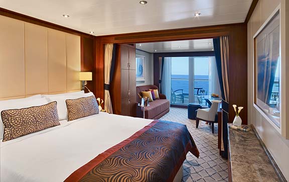 Located on Deck 8; Combine mid-ship suites 849 and 851 for suite 8491 or suites 846 and 848 for suite 8468 for a total inside space of 1,292 square feet (120 square meters) plus two verandas totaling 244 square feet (23 square meters)