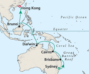 Sail out of Sydney’s magnifi cent harbour and along the Eastern coastline of Australia towards Hong Kong.