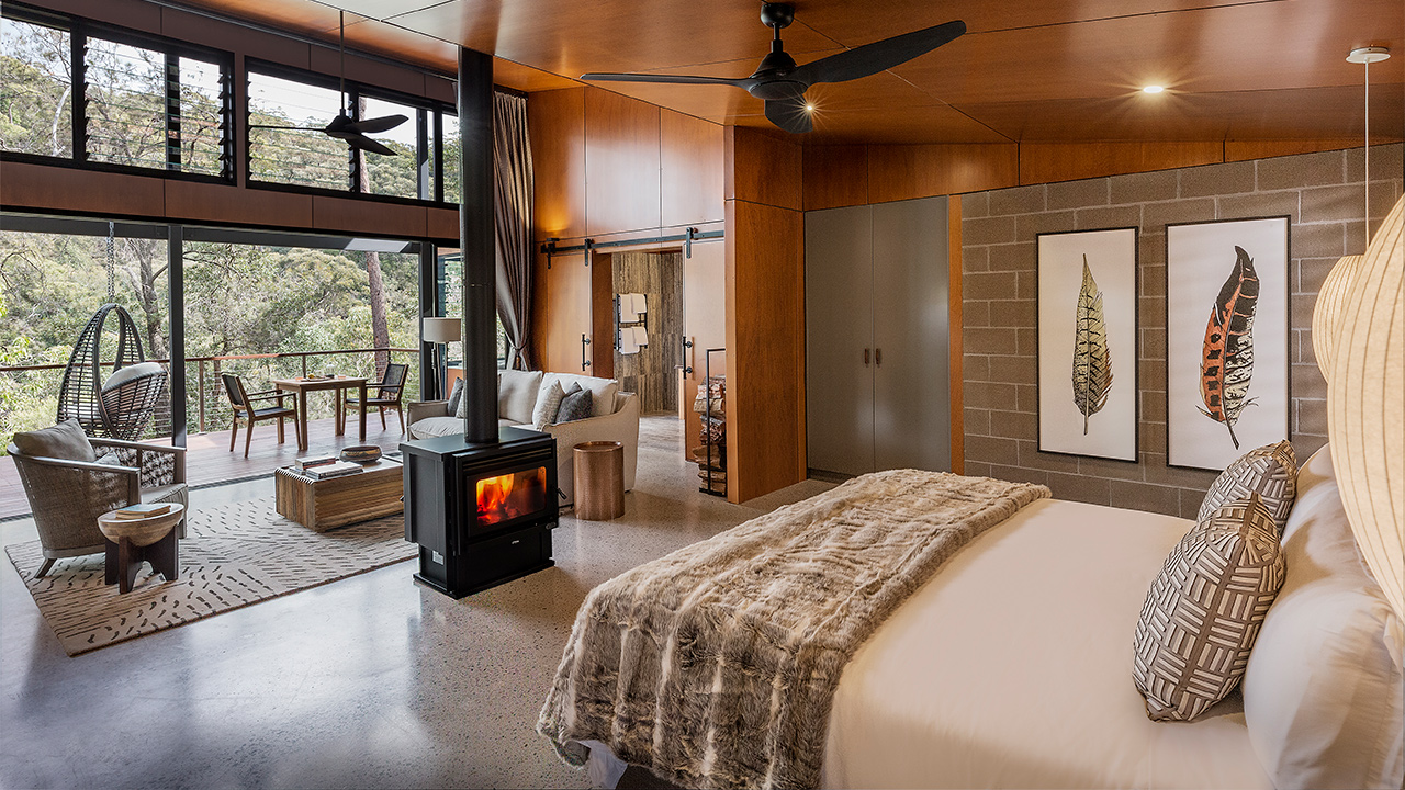 The Chief Suite spans two levels and is our premier suite featuring an upstairs bedroom with panoramic views. On a clear day you can see the Sydney city skyline 80 kilometres away. Downstairs is a spacious lounge, a dining area and kitchenette as well as a private deck where your secluded plunge pool awaits.