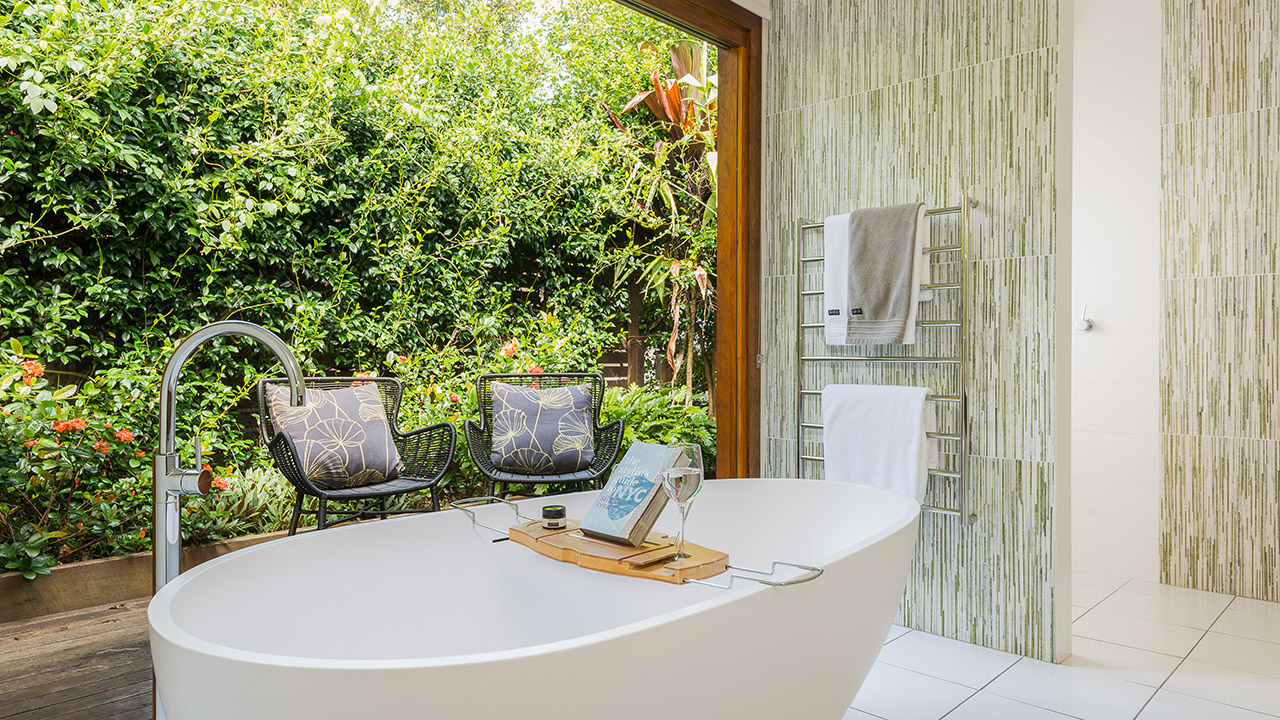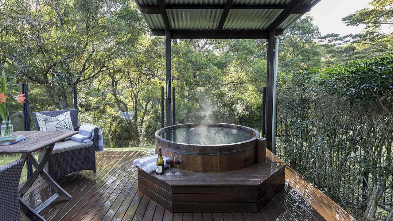 The stand-alone, private gardners villa features a spa bath, separate lounge and fireplace. This spacious villa is adjacent to Gardners Falls.