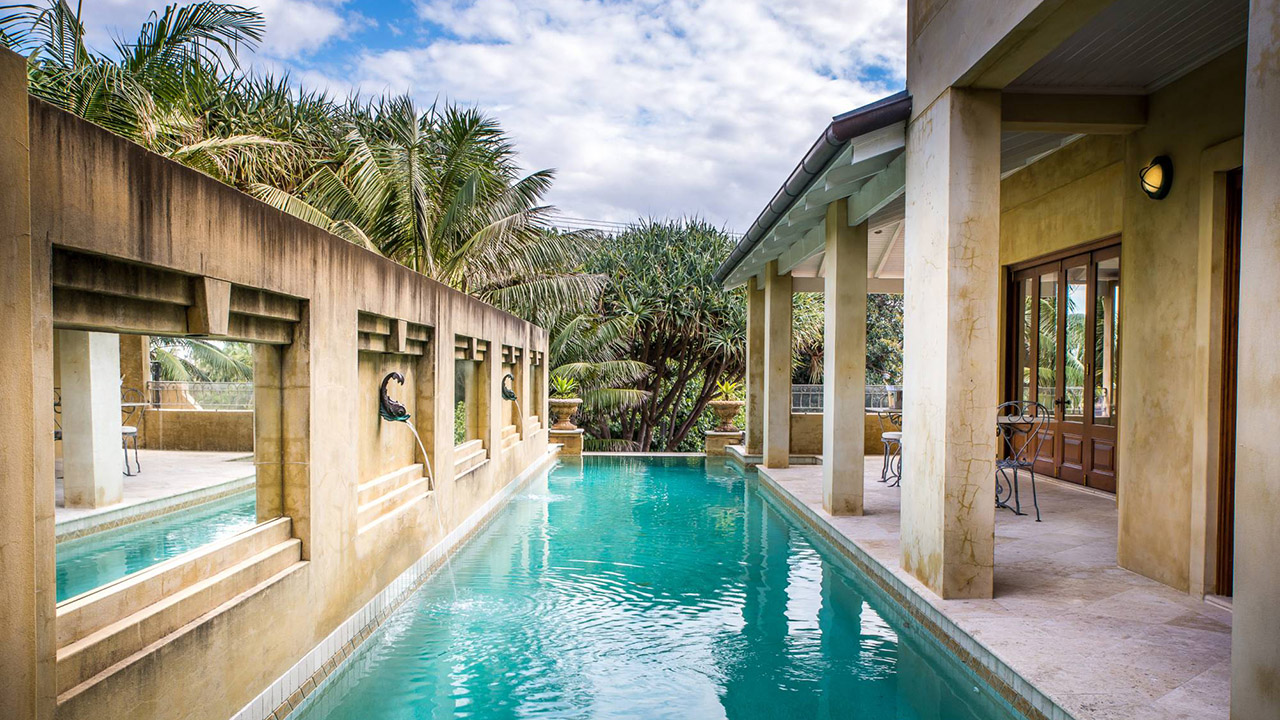 Victoria’s At Wategos is the perfect beachside escape surrounded by thriving tropical landscaped gardens. The property has several indoor lounge areas, with floor to ceiling glass and timber bi-fold doors. The western side of the property features a 16 x 3 metre lap pool with waterfall. A second 12 metre solar heated lap pool is located on the eastern side of the property featuring a cabana and sun lounge area. The indoor lounge areas are a great place to put your feet up and relax whilst absorbing the sea breeze and in the cooler months, two of the three lounge rooms, boasts roaring open log fire places. Beach towels, chairs and umbrellas, are all supplied and surfboard hire can be arranged as Victoria’s is only 100 metres from one of the most beautiful and exclusive beaches in Australia, surfing, fishing and sun bathing are virtually on the doorstep.