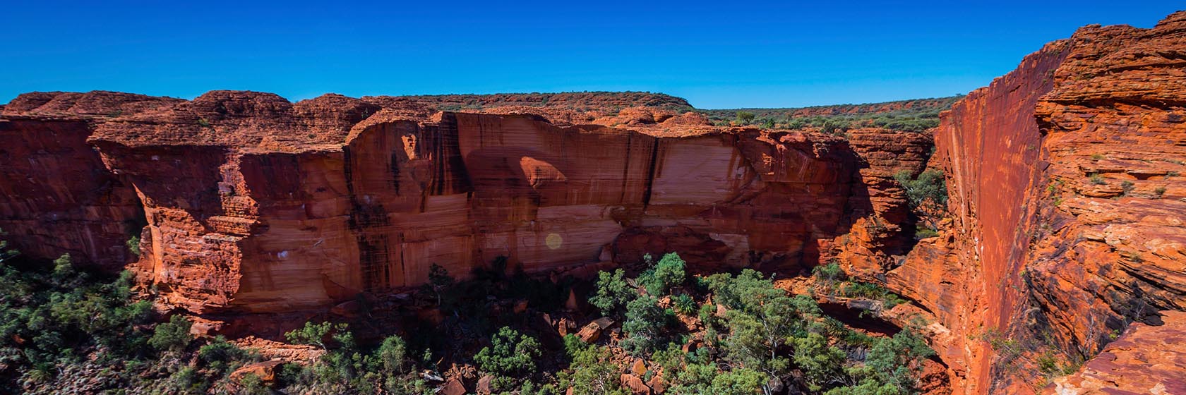 Collect your 4WD Land Cruiser and embark on a self-drive adventure to Kings Canyon via the Mereenie Loop through the spectacular Central Desert landscape. Arrive at Kings Canyon Resort, an oasis in the red desert plain.